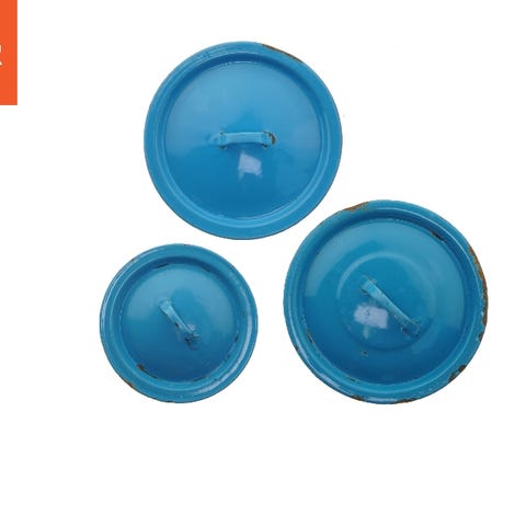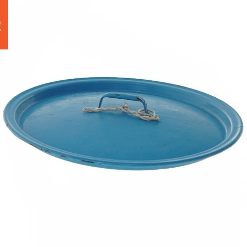 Dette er et rundt låg med en diameter på 24 cm, lavet af metal med en blå farve. Låget har en hævet håndtag i midten for nem løftning. Det viser tegn på slid med nogle mærker og farveafskalning, især ved kanterne og håndtaget.