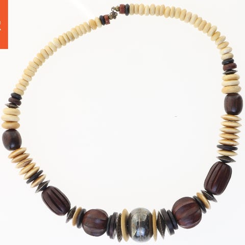 Halskæde lavet af små blå perler, der er flettet sammen. Halskæden har en længde på 45 cm og er udstyret med en metal-lås ved enderne, som gør det nemt at åbne og lukke den.
