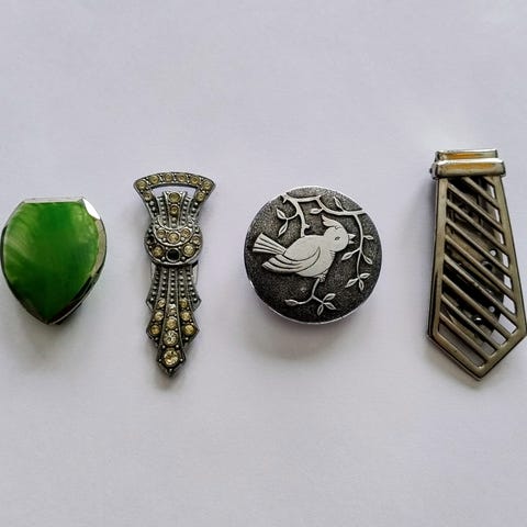 Dette er et dekorativt metalklip med to forskellige sider, begge med indgraverede motiver. Den ene side har et korsdesign med røde accenter, og den anden side har et abstrakt motiv med en person og fasan indgraveret med grønne og røde farver omkring. Klippet er 8,5 cm i størrelse.