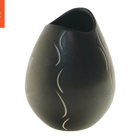 Denne vase er lavet af keramik med en asymmetrisk form. Den er mørkebrun og har en unik, lidt rå overflade, som giver den et kunstnerisk udtryk. Vasen måler 29 cm i højden og har en bred top, der smalner ned mod bunden. Den er ideel til dekoration og kan bruges til at præsentere både tørrede blomster og andre dekorative elementer.
