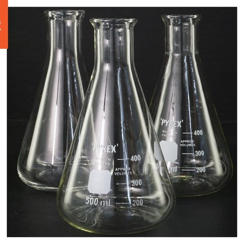 Disse er to klare glas Erlenmeyer kolber med målinger på siden, lavet af Pyrex. De er beregnet til at rumme op til 150 ml væske. Kolberne har en konisk form med en bred bund, der smalner ind mod toppen. De er velegnet til laboratoriebrug eller dekoration.