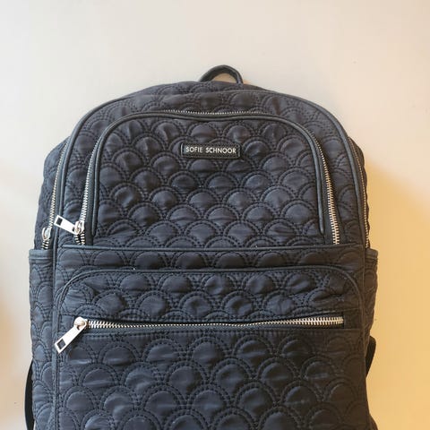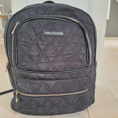 En skoletaske i quiltet design med målene 42x36 cm. Den har en primær lynlåslomme foran samt flere små lommer til opbevaring. Rygsækken er udstyret med justerbare skulderstropper og en bærestrop. Farven er rosa, og rygsækken bærer et Sofie Schnoor-logo på forsiden.