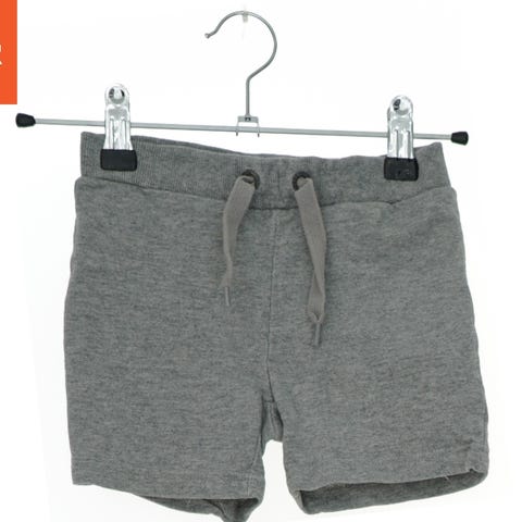 Et par børneshorts med et gråt stof, der er prydet med et mønster af sorte og blå pletter. Shortsene har en elastisk linning med snoretræk foran og omfatter lommer både foran og bagpå.