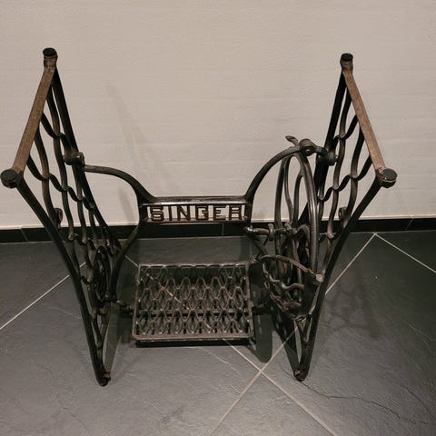 Denne genstand er en vintage miniature symaskine med bevægelige dele. Den er dekoreret med detaljerede blomstermønstre og udsmykninger i levende farver på en sort baggrund. Symaskinen har en manuel håndcrank og en base, der holder en stabil position. Den lille størrelse på 10x10 cm gør den perfekt som en dekorativ genstand eller en samlerobjekt. Mærket Western Germany.