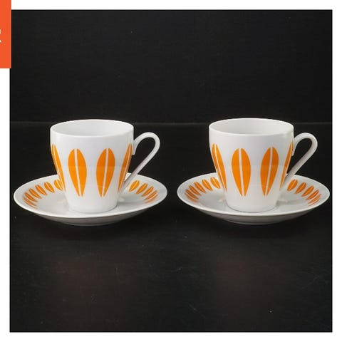 Kaffekop med matchende underkop, begge med det karakteristiske geometriske mønster i orange fra Lotus Lyngby. Koppen har en diameter på 7,5 cm, og underkoppen har en diameter på 13 cm. Både kop og underkop er lavet af porcelæn.