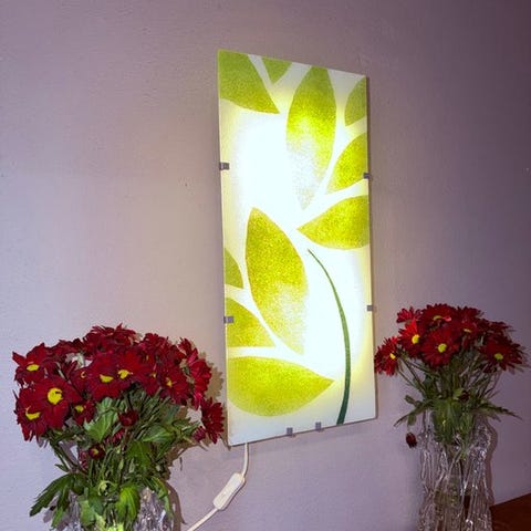 Lampen består af en separat glasplade og grå metalbeslag.