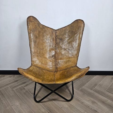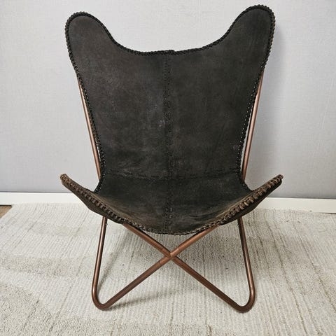 Butterfly stol model 3107 af læder og metal, oprindelse Europa, anslået periode 1990–2000, i god brugt stand med mindre tegn på ælde og pletter; dybde 71 cm, højde 89 cm, bredde 78 cm. Klik på den blå "gå til varen" knap, for at købe eller byde på denne vare. Den samlede pris vil blive vist inden du afgiver dit bud.