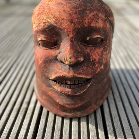 Polychromatisk træmaske fra Afo-folket i Nigeria, dateret til midten af det 20. århundrede, højden 55 cm, fra privat samling og med provenance Berthe Hartert og Argiles collection Barcelona, i god stand og sælges uden stand. Klik på den blå "gå til varen" knap, for at købe eller byde på denne vare. Den samlede pris vil blive vist inden du afgiver dit bud.