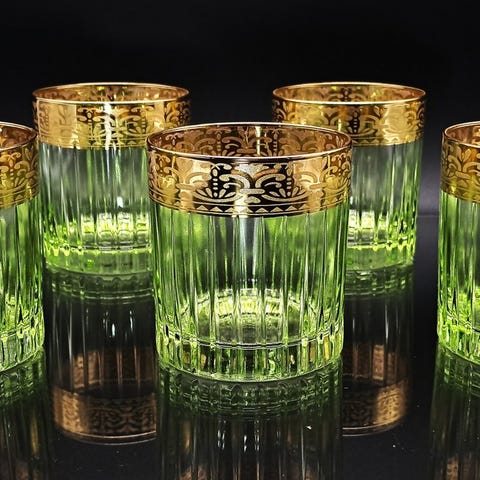 seks moderne Artemisia krystalvinsglas fra Italien, 20 cm høje og 8 cm brede, i næsten som ny stand, med 24 kt gulddetaljer i seks pastelfarver, håndlavede i Italien. Klik på den blå "gå til varen" knap, for at købe eller byde på denne vare. Den samlede pris vil blive vist inden du afgiver dit bud.
