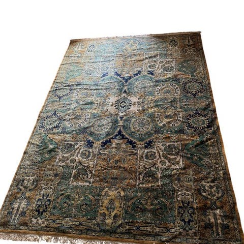Grænserne er rigt mønstrede med klassiske ornamentbånd, der indrammer den centrale komposition og forstærker dets antikke karakter. Den naturlige farvepalet og den ældede patina giver tæppet en autentisk vintage tilstedeværelse, egnet for både traditionelle og moderne