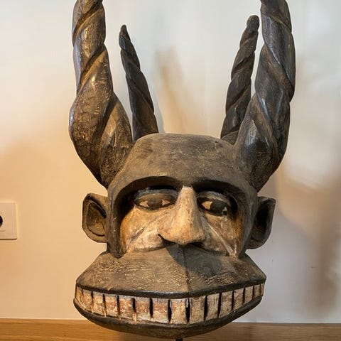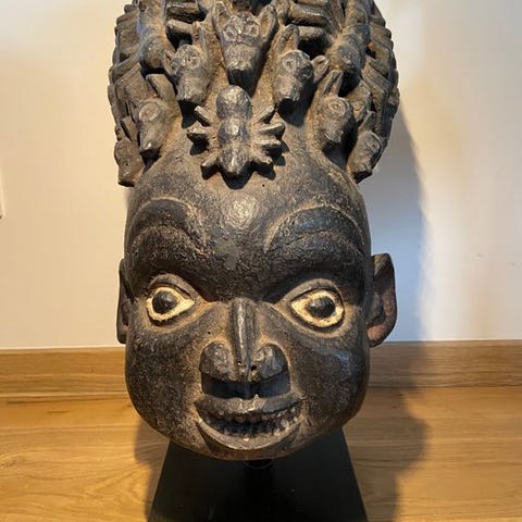 Geledé-maske fra Benin, Yoruba-folket, midten af det 20. århundrede, polykromt træ, højde 36 cm, i god stand, fra privat samling. Klik på den blå "gå til varen" knap, for at købe eller byde på denne vare. Den samlede pris vil blive vist inden du afgiver dit bud.