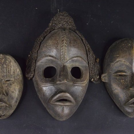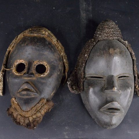 Par Dan-dansemasker fra Côte d'Ivoire, originalt; træ med snor; dimensioner cirka 210 × 135–140 mm, dybde 70–75 mm. Klik på den blå "gå til varen" knap, for at købe eller byde på denne vare. Den samlede pris vil blive vist inden du afgiver dit bud.