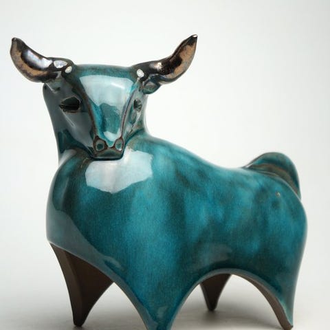 Helt fremstillet af emaljeret keramik i blå og hvid, der leger med den gyldne bronzefarve.