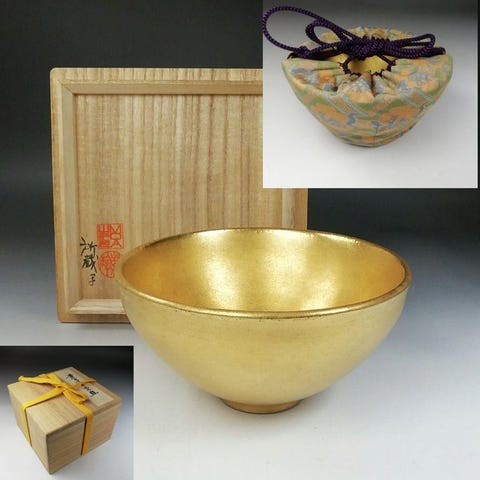 Stykket ledsages af sin originale træopbevaringsboks (tomobako). Boksen bærer håndskrevet blækinskrift og et rødt segl, der angiver værkets titel og tilskrivning, som det var almindeligt for tekeramik. Stil og præsentation antyder et værk beregnet