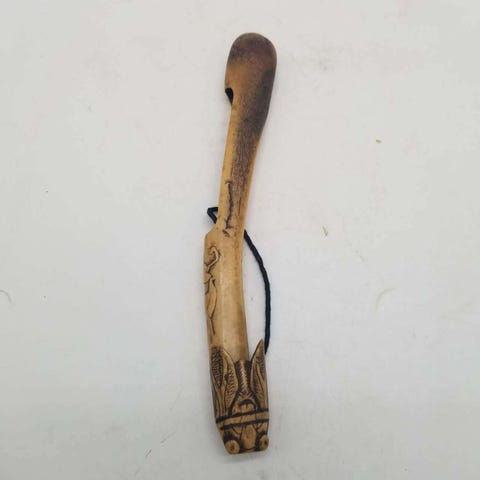 Japansk knoglekiseru-pibe & læder tobakspung med indgraveret kobberløve - Kno...