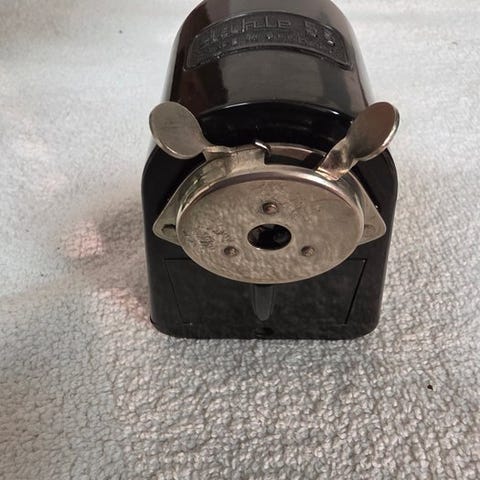 Dahle model 77 metal blyantspidser i Art Deco-stil, fremstillet i Tyskland, dimensioner cirka 12 cm i højden, 7,6 cm i bredden og 12 cm i dybden, vægt 700 g, estimeret periode 1950–1960, i fremragende stand med minimale tegn på brug og komplet med bordklemme. Klik på den blå "gå til varen" knap, for at købe eller byde på denne vare. Den samlede pris vil blive vist inden du afgiver dit bud.