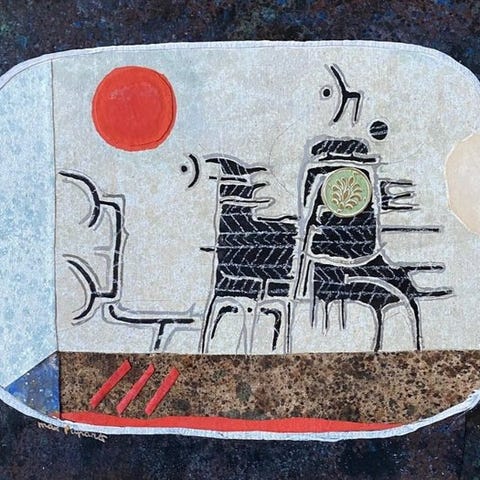 Denne neo-cubistiske komposition af Jean-Pierre Dolla, udført omkring 1980, vidner om en subtile balance mellem geometrisk konstruktion og menneskelig tilstedeværelse.