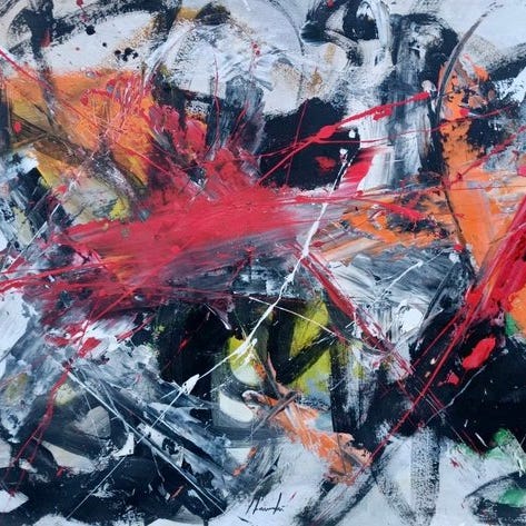 Denne ekspressive semi-abstrakte komposition af den græske maler Eirini Badola skildrer et køretøj med hjul, gengivet gennem energisk penselstrøg og lagdelte farvefelter.