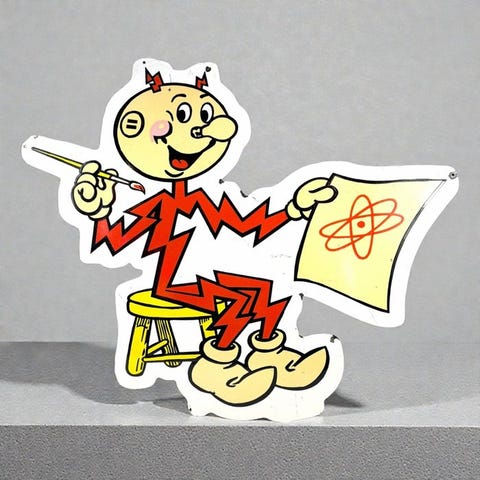 Vintage emaljeret reklameskilt fra Reddy Kilowatt, den kendte maskot i elverdenen. Dette skilt er et smukt stykke reklame-memorabilia og populært blandt samlere af industriel reklame, automobilia og vintage skiltning.