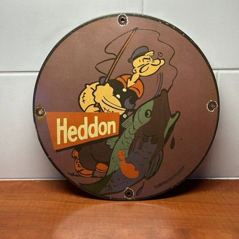 Emailmalet reklameskilt fra Heddon med Mickey Mouse i en fiskescene; replica i god brugt stand med mindre aldersmærker og pletter, fremstillet i USA, 30 × 30 cm, estimeret periode 2000–2010. Klik på den blå "gå til varen" knap, for at købe eller byde på denne vare. Den samlede pris vil blive vist inden du afgiver dit bud.