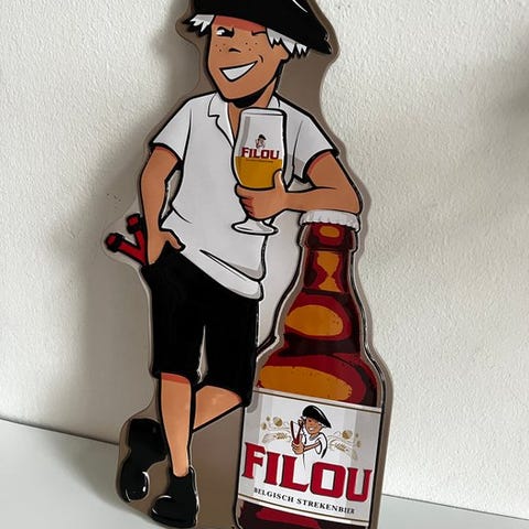 Skiltet viser brugsspor og let slid i takt med alderen, hvilket bidrager til den vintage charme. På grund af det markante design og de varme farver er dette en dekorativ genstand til baren, mancave, horeca eller samling af vintage reklameskilte.
