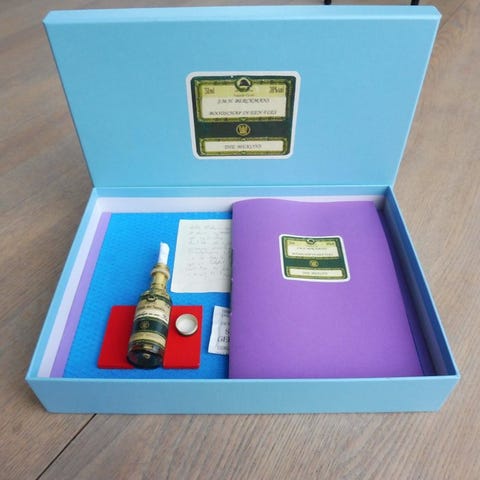 Denne håndskrevne navn står på forsatsbladet, hvor den er monteret. Tryllefremkaldende næsten fyldt scrapalbum med flotte små og mellemstore farvede kobberstik. Sjældent.