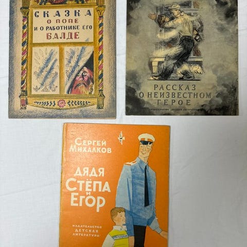 Sæt af fire illustrerede bøger fra den russiske litterære tradition, udgivet i den sovjetiske æra (midten af det 20. århundrede).