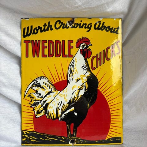 Tweddle Chicks emalje reklameskilt med han foran en rød sol med stråler, fremstillet i USA, reproduktion i god stand med mindre tegn på alder og pletter, højde 25,5 cm, bredde 22,5 cm, estimeret periode 2000–2010, reliefformet model. Klik på den blå "gå til varen" knap, for at købe eller byde på denne vare. Den samlede pris vil blive vist inden du afgiver dit bud.