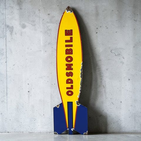 Et bemærkelsesværdigt og iøjnefaldende emaljebord i form af et klassisk Route 66-skjold, udført i stærke farver og med en ikonisk reference til 1970 Roadrunner Superbird og Mother Road Plymouth.