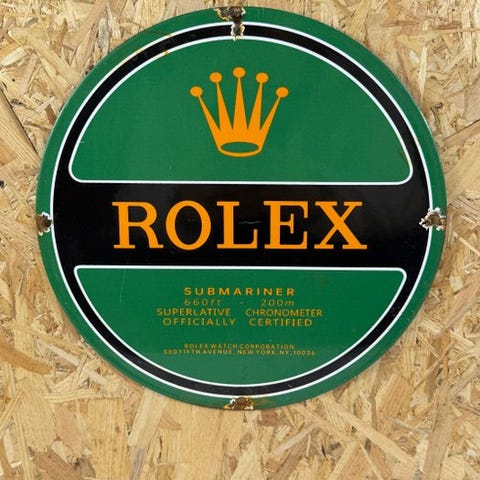 Rolex emaljeskilt, lavet af emalje, 30 cm høj, 30 cm bred, 0,3 cm dyb, anslået periode 2000–2010, reproduktion/klon, oprindelse Britiske Jomfrostater, i god stand med mindre aldersrelaterede tegn og pletter. Klik på den blå "gå til varen" knap, for at købe eller byde på denne vare. Den samlede pris vil blive vist inden du afgiver dit bud.