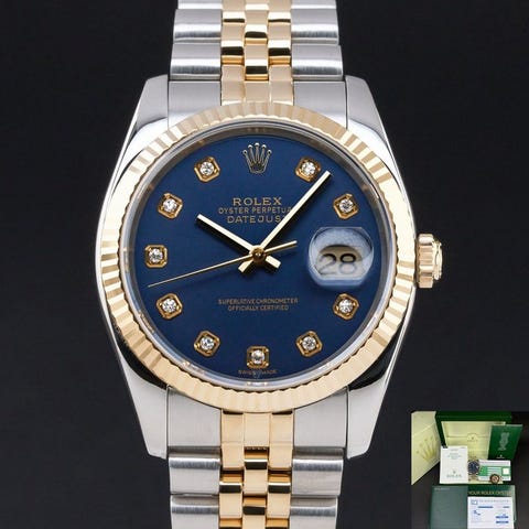 Rolex Datejust 116200, et rustfrit stål ur til unisex med kasse på 36 mm, sort urskive, automatisk bevægelse, produceret i 2006, med original æske og papirer men uden original garanti. Klik på den blå "gå til varen" knap, for at købe eller byde på denne vare. Den samlede pris vil blive vist inden du afgiver dit bud.