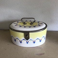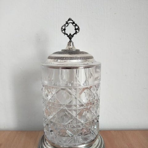 Sølvbelagt kiksæske bestående af en cylindrisk beholder med låg og øverste håndtag, ledsaget af det respektive fad.