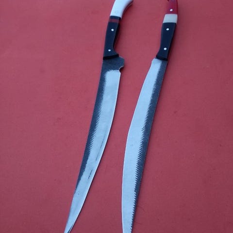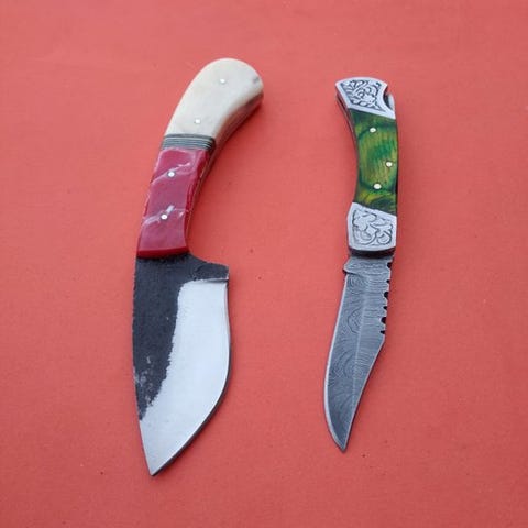 "Monsieur Cuisine"-paret af K. Romain er en mesterklasse i elegance og funktionalitet. Skiveren glider gennem kødstykker med præcision, mens det sammenklappelige knivblad, en Romain-innovation, kan opbevares pænt og bæres diskret. Begge knive viser Romains dedikation til håndværket, med subtile nuancer der løfter dem fra værktøj til kunstværker. Perfekt for den kræsne kok eller samler, disse knive legemliggør essensen af fransk sofistikering og K. Romains innovative ånd. Et sjældent møde mellem form og funktion, ideelt for dem der værdsætter livets finere ting.