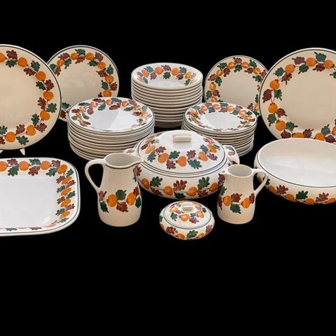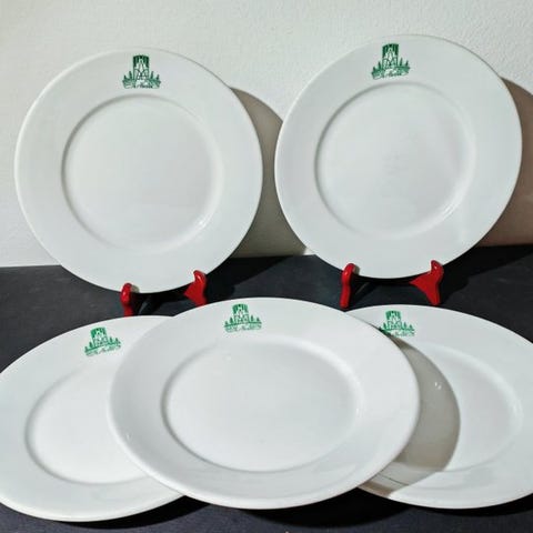 Dessertservice bestående af et serveringsfad og 6 små tallerkener med kniv, årgang 1967, aldrig brugt