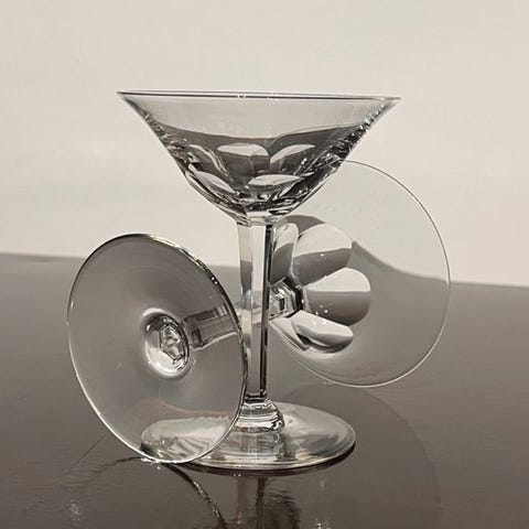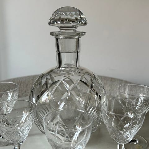 En fantastisk likørservice i farvet skåret krystal bestående af seks stilkede glas.