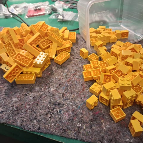 En samling blå LEGO klodser sælges samlet. Der er vist både nye og brugte, men de rigtig misfarvede er fjernet.