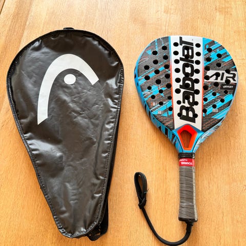 Babolat padelbat i sort og rød. Battet har perforeret slagflade og hvidt greb med medfølgende håndledsrem. Brugt 20-25 gange. Fejler intet.