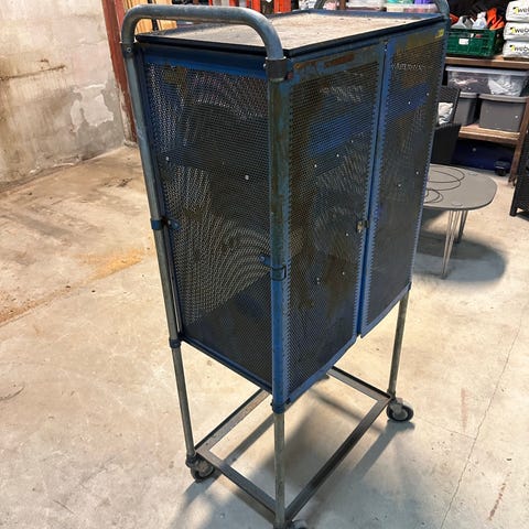 Metalskab værkstedsskab med hylder i blå. Skabet har to låger og flere indvendige hylder, der giver mulighed for opbevaring af værktøj, materialer eller andre genstande. Indersiden har perforerede sider, som kan bruges til ophæng af kroge eller andet tilbehør. Velegnet til garage, værksted eller lager, hvor der er behov for robust og overskuelig opbevaring.uden nøgle