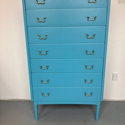 Stor lysblå kommode med 6 store skuffer. Den er 160 cm lang og 50 cm dy