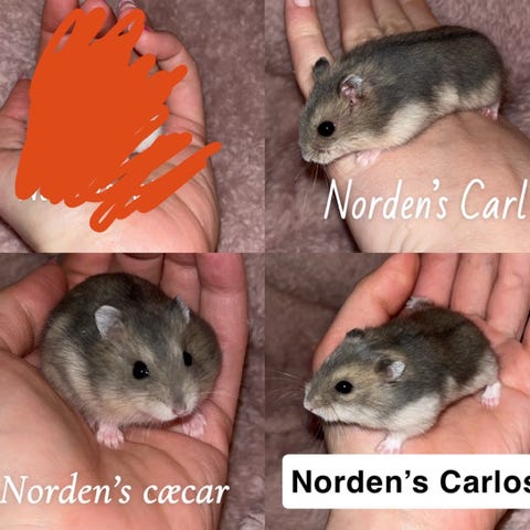 Ungerne er født og opvokset i rolige omgivelser i vores opdræt og de er dermed håndteret siden de var helt små og de er derfor 100% håndtamme og vant til daglig håndtering. Ungerne er efter søde og meget rolige forældre og man sikre sig derfor en hamster med et rigtig godt og roligt temperament. Der er 4 hunner & 2 hanner, en enkelt i grå, resten er sorte m hvid mave/ bryst eller stribe.