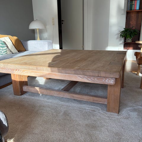 Håndlavet sofabord, lavet af tidligere ejer. Ikke sikker på træsorten, men det ligner eg. Behandlet med hvidpigmenteret olie.