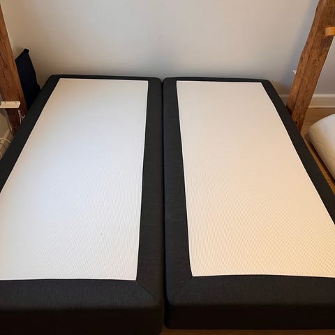 To flotte og super velholdte enkeltsenge, kun brugt som gæstesenge. Både madrasser og topmadrasser er uden pletter, da der altid har ligget en ekstra topmadras ovenpå. Sengene står stabile, men der medfølger ikke samlebeslag til at låse dem sammen.
