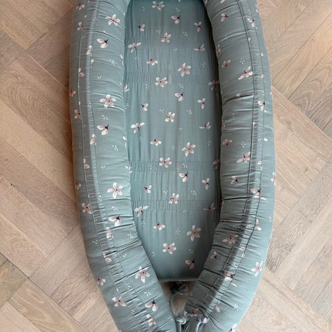 babynest tilbehør med blomstret mønster. Babynesten har polstrede kanter og snorelukning, så størrelsen kan justeres. Ydersiden er i et flerfarvet mønster med rosa og grå nuancer, og kanten er ensfarvet grå. Velegnet som tryg liggeplads til spædbørn i barnevogn, tremmeseng eller på sofa og gulv under opsyn.