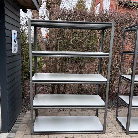 Reol i metal med tre hylder. Øverste og midterste hylde er i glas, nederste hylde er i massivt materiale. Stellet er i sortlakeret metal med en enkel, rektangulær ramme. Reolen er åben på alle sider og egner sig til opbevaring eller udstilling af genstande i stue, kontor eller entré. Designet er enkelt og moderne med lige linjer og neutral farve, som gør den let at placere i forskellige rum.