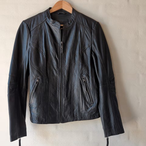 Lækker skindjakke med mange rå detaljer. Kun brugt få gange, men vil blive smukkere, når den bliver brugt mere. Det blødeste skind. Nypris er 2800 kr.