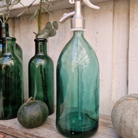 Flot vintage glasflaske med originalt sifonhoved. Perfekt som samlerobjekt, barindretning eller dekoration.