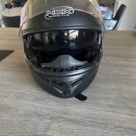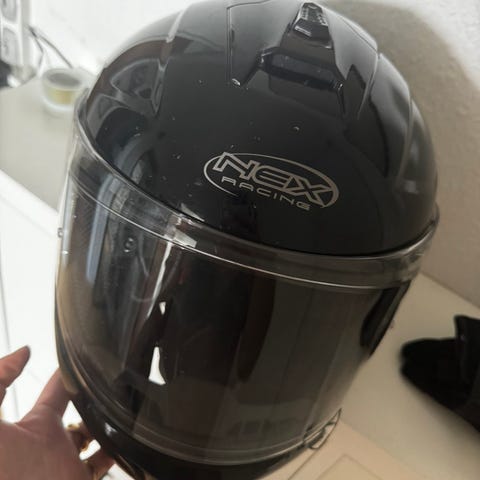 Nexx Racing motorcykelhjelm i fuldface-design. Hjelmen er udført i mat sort med klart visir, der kan vippes op. Indersiden har polstret foring og kindpuder for bedre pasform og komfort. Velegnet som standard motorcykelhjelm til vejbrug. Størrelse og materiale er ikke angivet.