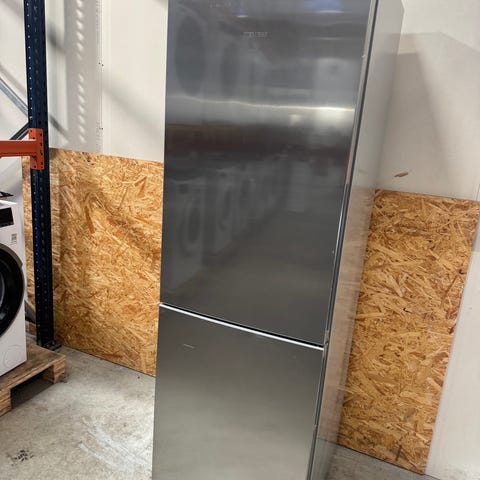 Køle-fryseskab i stålfinish med kølerum øverst og fryser nederst. Indvendigt kølerum med flere glashylder, dørhylder samt grøntsagsskuffe. Fryserdel med skuffer til opbevaring af frosne varer. Velegnet til almindeligt køkkenbrug med kombineret køle- og frysefunktion i ét skab.