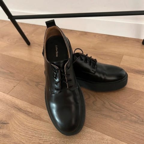 Lædersko snøresko i sort i størrelse 40. Skoene har lukket snørelukning og en mønstret gummisål. Overdelen fremstår i glat læder med en enkel syningsdetalje langs siderne. Velegnet som hverdagssko eller pæne sko til både arbejde og fritid.
