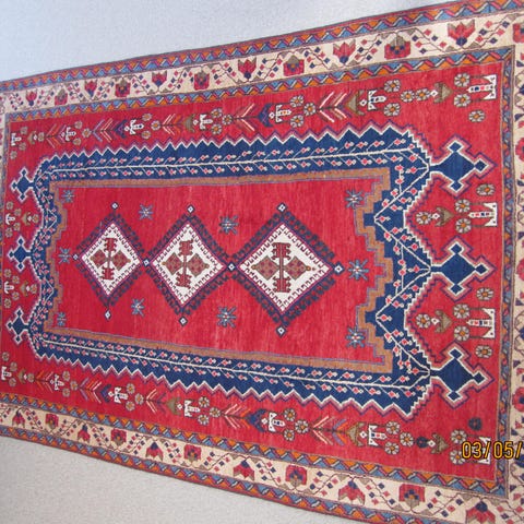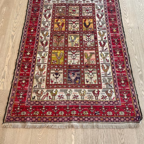 Håndknyttet tyrkisk tæppe i uld med flerfarvet mønster. Tæppet har et centralt felt opdelt i rektangulære felter med stiliserede fugle- og dyremotiver samt geometriske figurer. Bred bort med gentagne mønstre og frynser i enderne. Velegnet som gulvtæppe i stue, entré eller andre opholdsrum, hvor man ønsker et klassisk, mønstret uldtæppe.